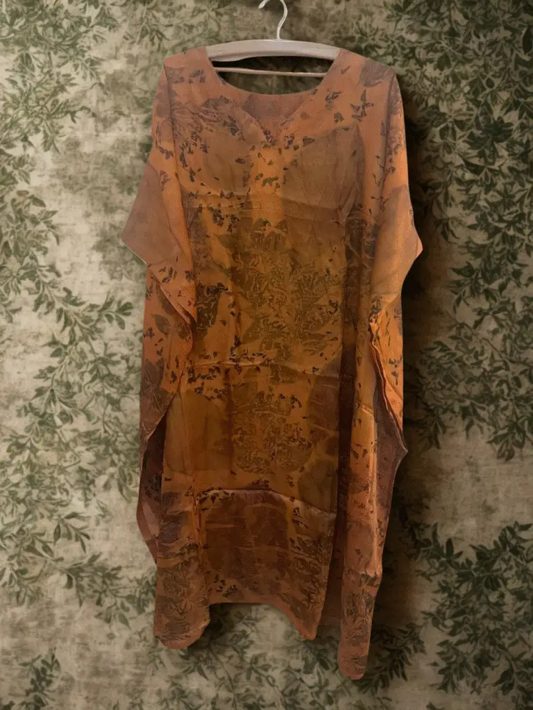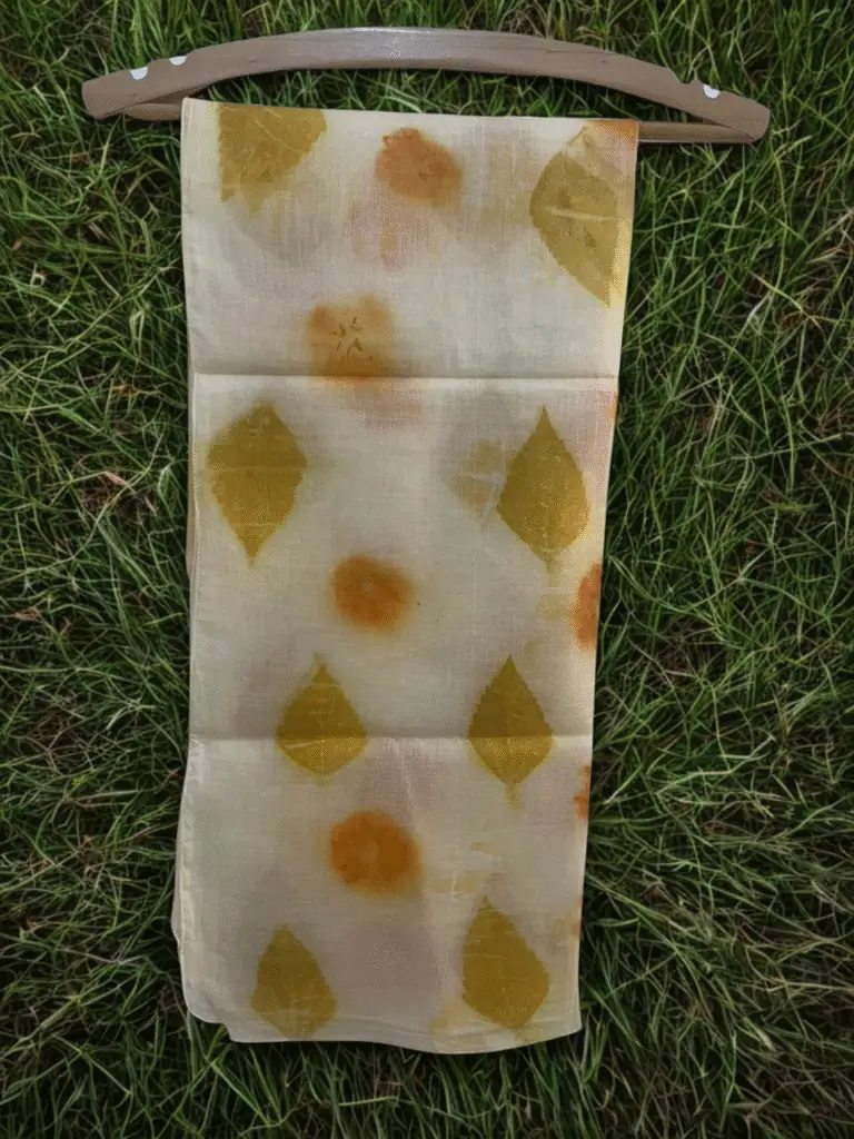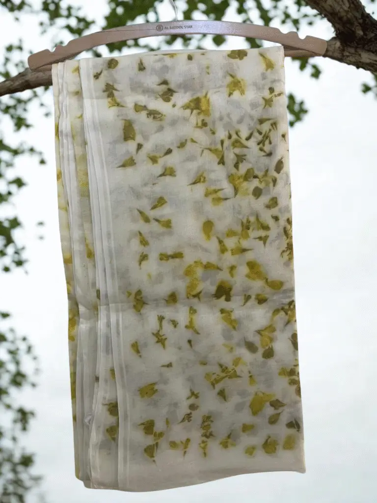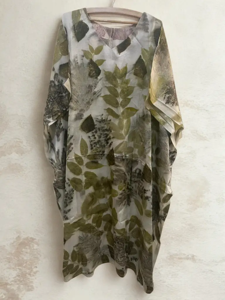 Each piece is handcrafted by artisans who gather botanicals at their peak, arrange them on natural fabrics like silk and cotton, then use steam to transfer their colors and shapes. No two pieces ever look the same.